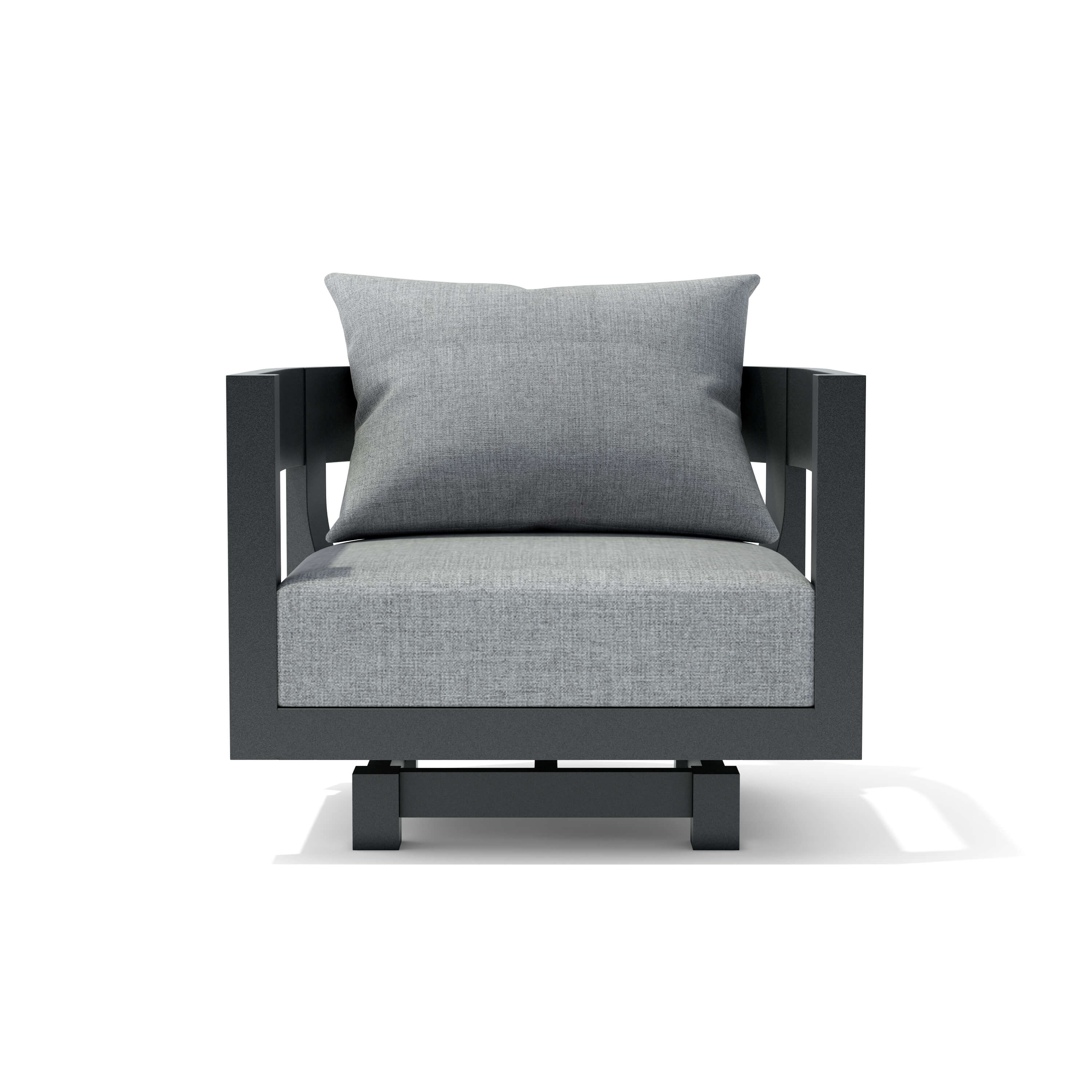 Enjoy the great outdoors in the comfort of your home with the Coronado Swivel Aluminum Armchair. Comfortable and stylish it features a smooth and seamless swivel mechanic that rotates to 360 Degrees of movement holding firmly in place at any position. Machine crafted from an aluminum frame, it’s powder coated and finished in a dark grey color. Shaped to an exquisite round curve design, it’s the perfect material suited to handle the outdoor weathers of rain, hail, or shine. Includes 6” thick deep seating cushion and pillow from All-Weather Sunbrella Fabrics with your choice of color option.