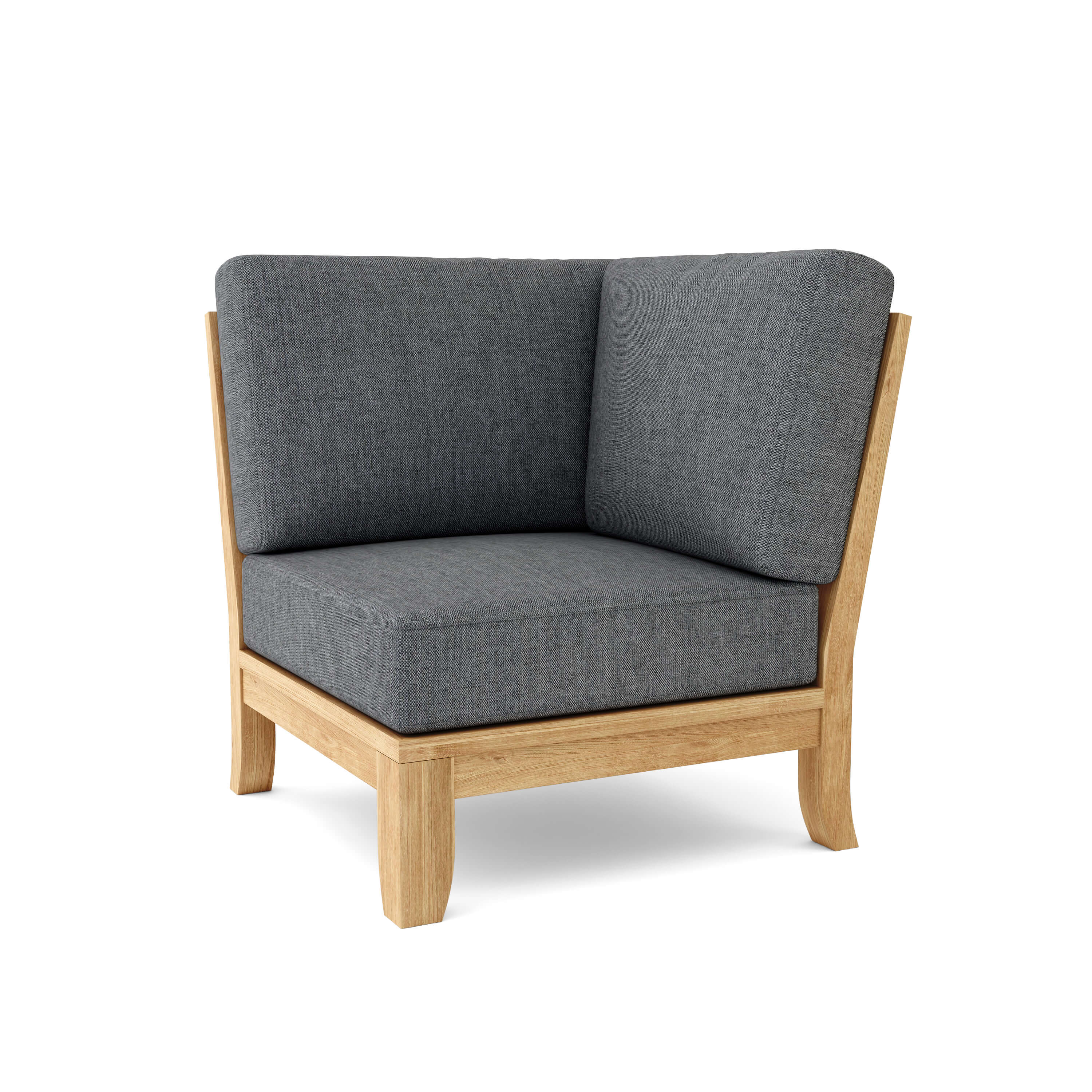 The Riviera Luxe Corner Modular exhibits classic design with deep seating comfort in the luxury of the outdoors. As the corner piece of the set, add the Center Modular Chair, Left Modular Chair, Right Modular chair, Ottoman footrest, a coffee table, and a side table from the Riviera Luxe Modular Collection for a complete deep seating set. Includes Sunbrella All-Weather cushions 27” deep and 6” thick from a variety of fabric pattern and color options. Built from genuine Grade-A Teak sanded smooth without finish, it is the perfect chair for your outdoor needs.