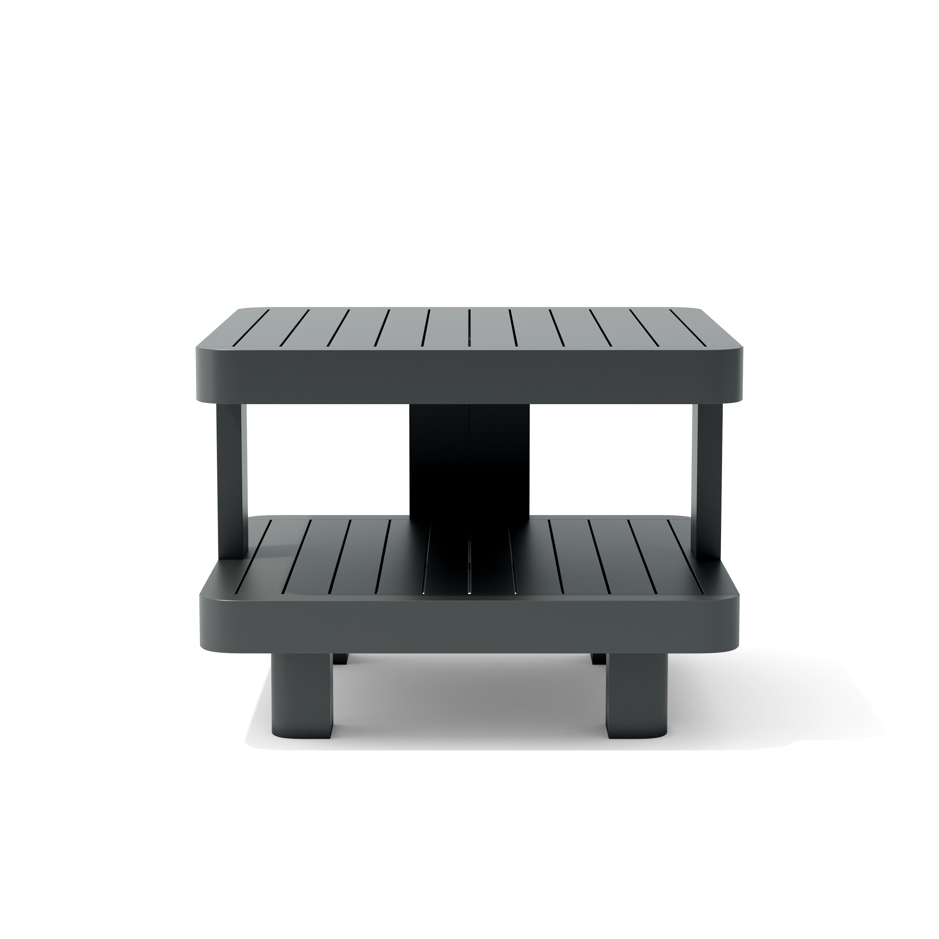 The perfect side table to place your favorite book, drink, or magazine, the Granada Aluminum Side Table is a two-tier side table machine crafted of aluminum and finished in a dark grey powder coating. As part of the Granada Deep Seating Aluminum Collection; complement the side table by adding the Granada Armchair, Swivel Armchair, Sofa, Loveseat, Ottoman, and Coffee Table for the ultimate deep seating experience. Quality built and durable, this aluminum table is the perfect material to withstand continued outdoor use.