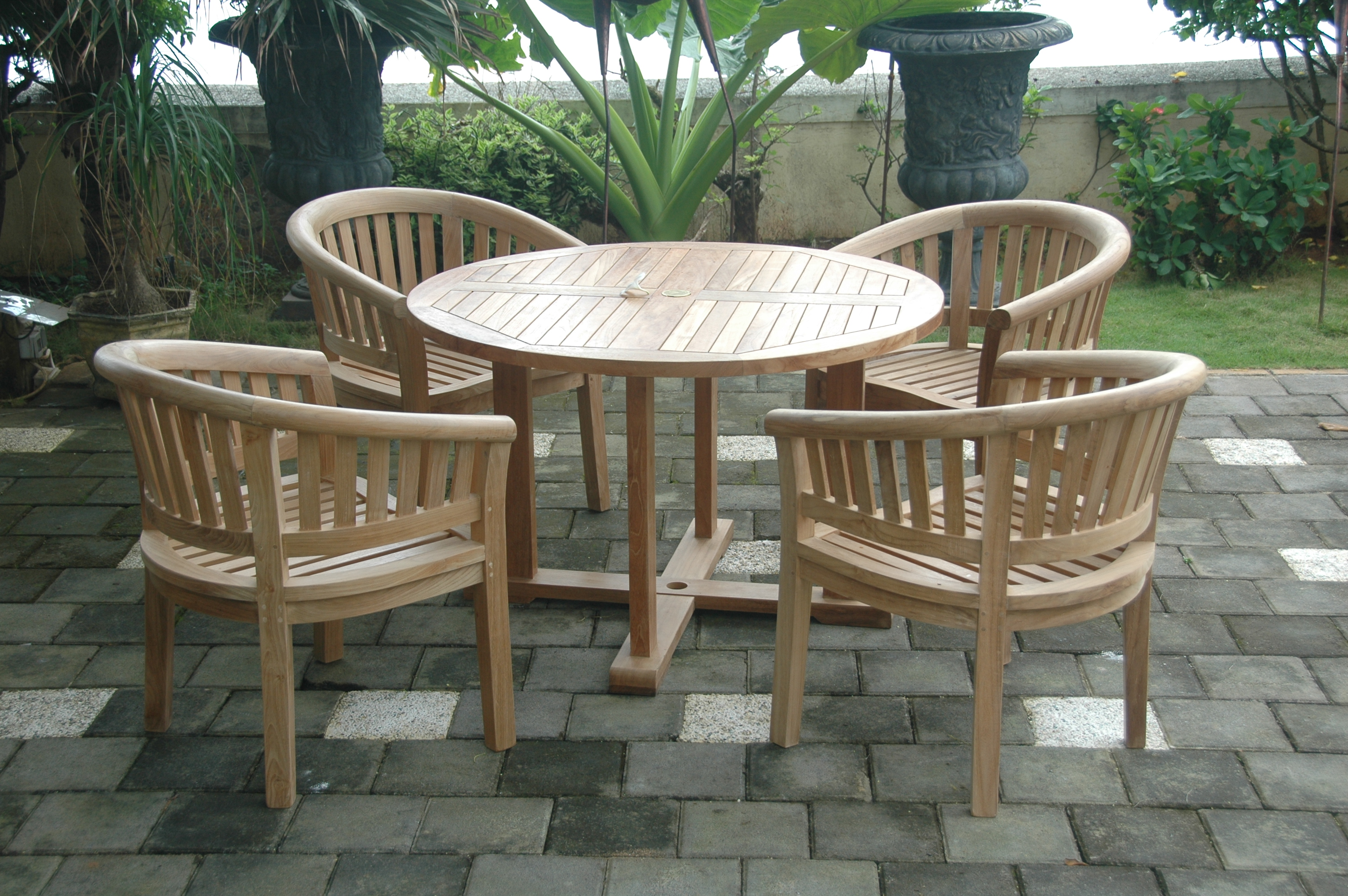 Quality built and sturdy, the Tosca 47" Round Table with a 2" umbrella hole and brass plug when not in use is the perfect table for outdoor dining and living. This set also includes the thick and quality built Curve Dining Armchairs that arrives fully built and is machine crafted and sanded smooth making the perfect collection for your outdoor living furniture. Table and chairs are all constructed using mortise and tenon construction for strength and durability, and the wood is of genuine Grade-A Teak thats left untreated in its natural form and color. This set will provide decades of enjoyment for family and friends. Add additional Cushions from All-Weather Sunbrella fabrics for extra comfort. The perfect conversation and outdoor dining set for four.