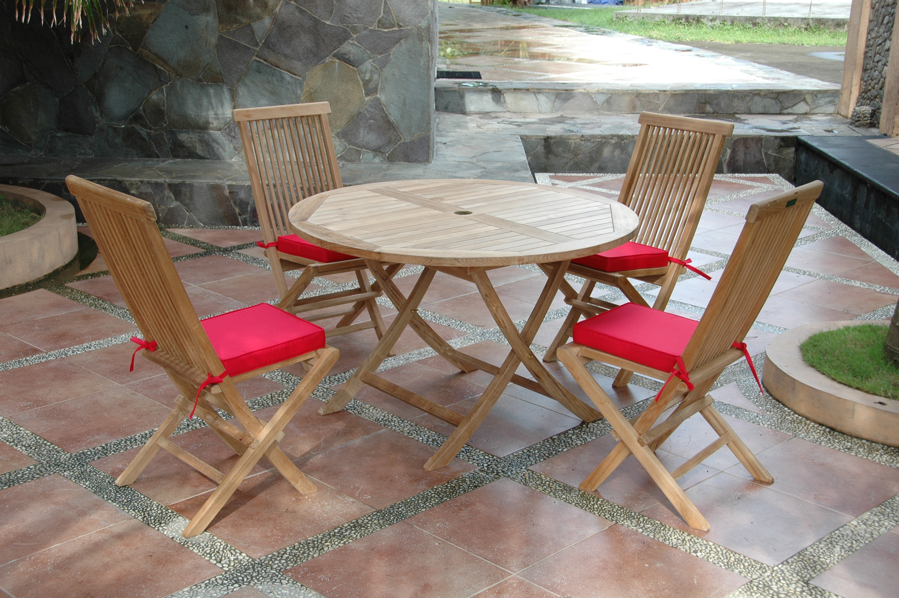 A versatile dining set for the outdoors, the Bahama 47" Round Folding Table with four Classic Folding Chairs is a convenient and easily accessible dining set for storage and movement when not in use. Simply fold and unfold the set in seconds; the perfect furniture set for boating, restaurant, and café where space is limited or where chairs are only required occasionally. Made of premium grade unfinished teak, this set is sanded smooth for a natural smooth touch.