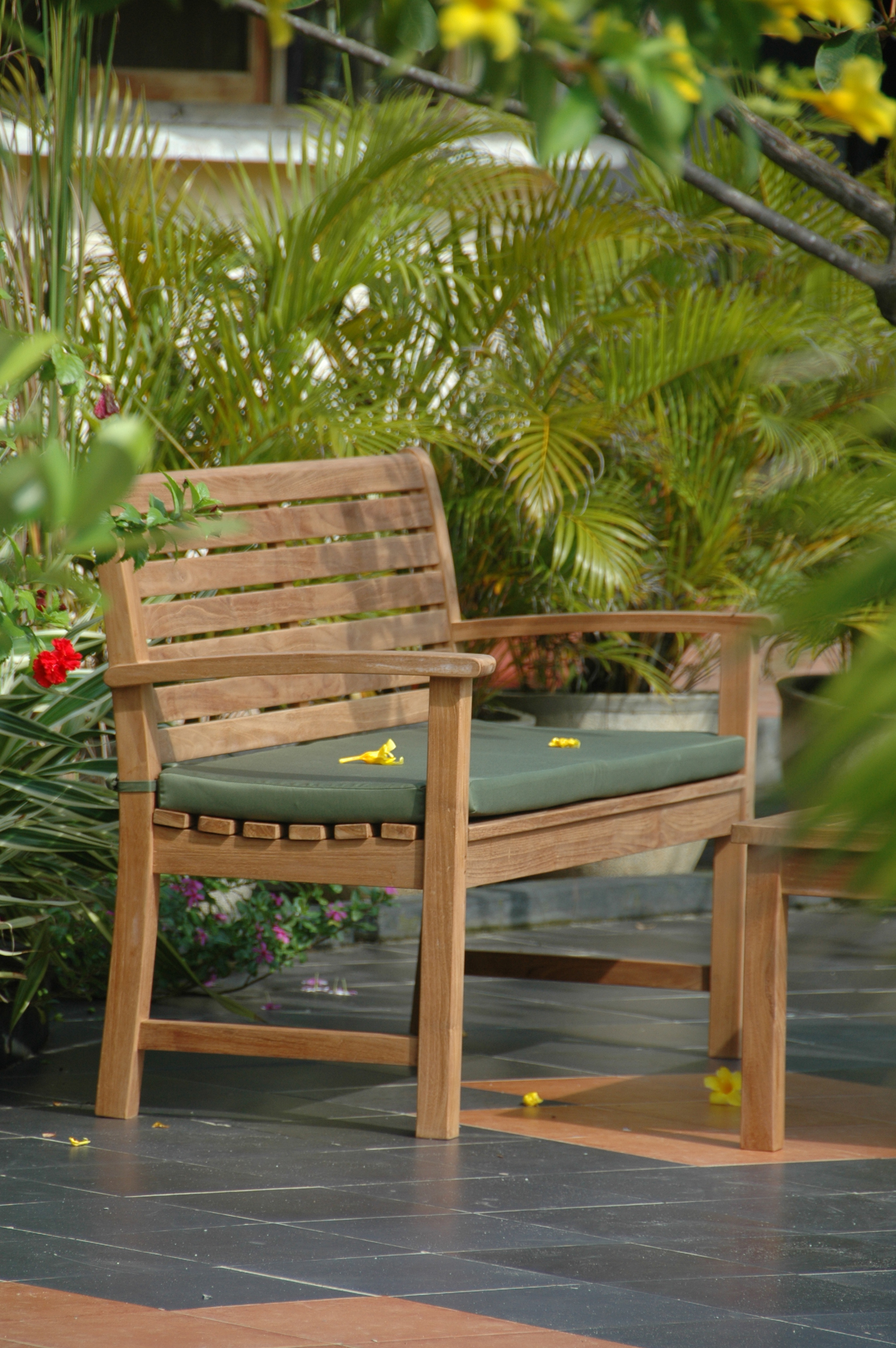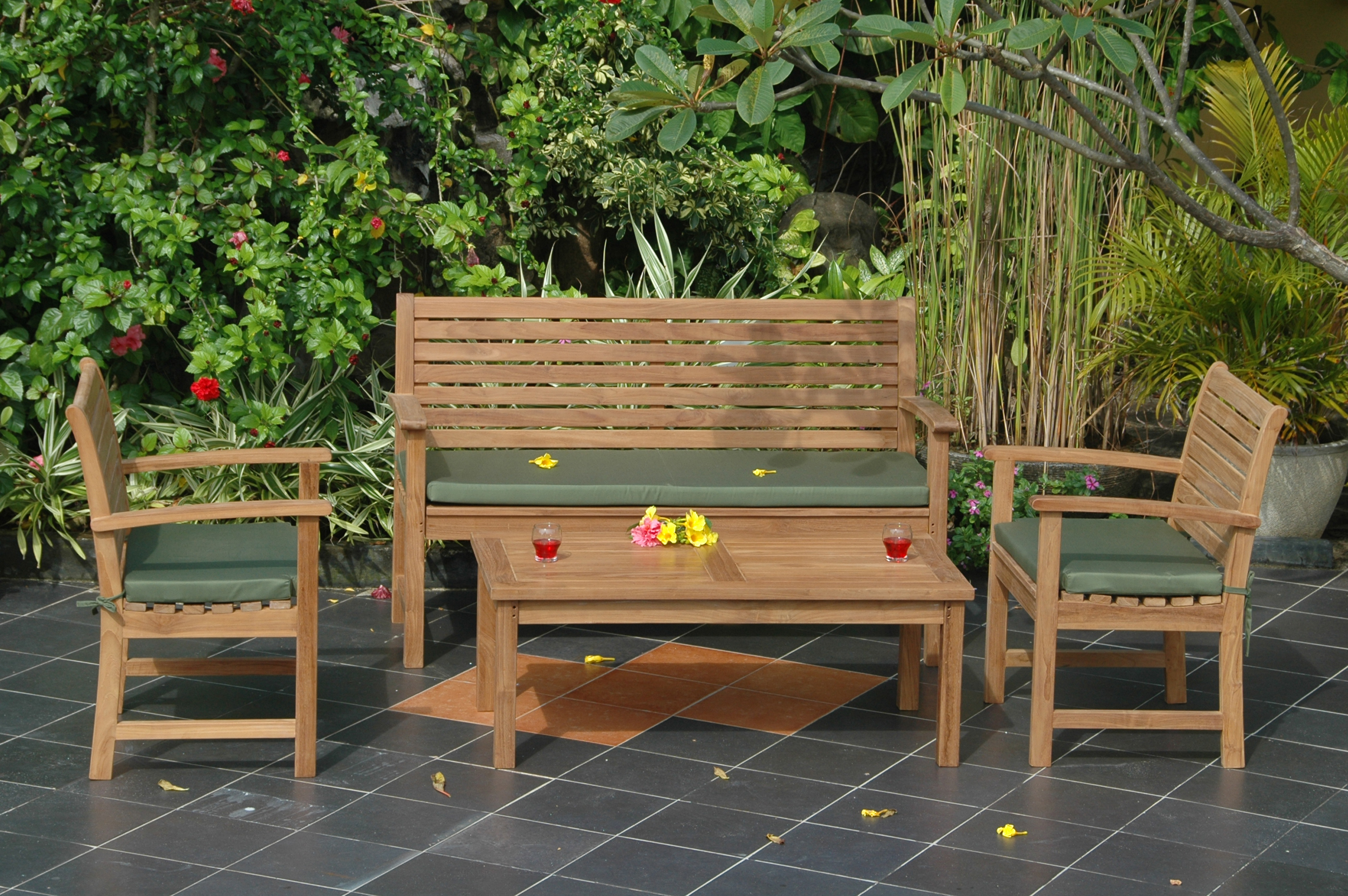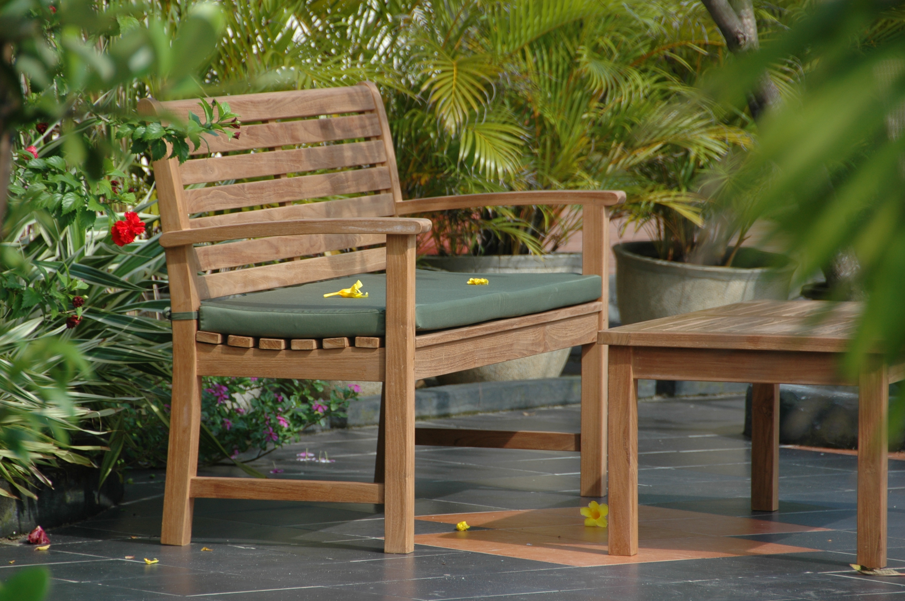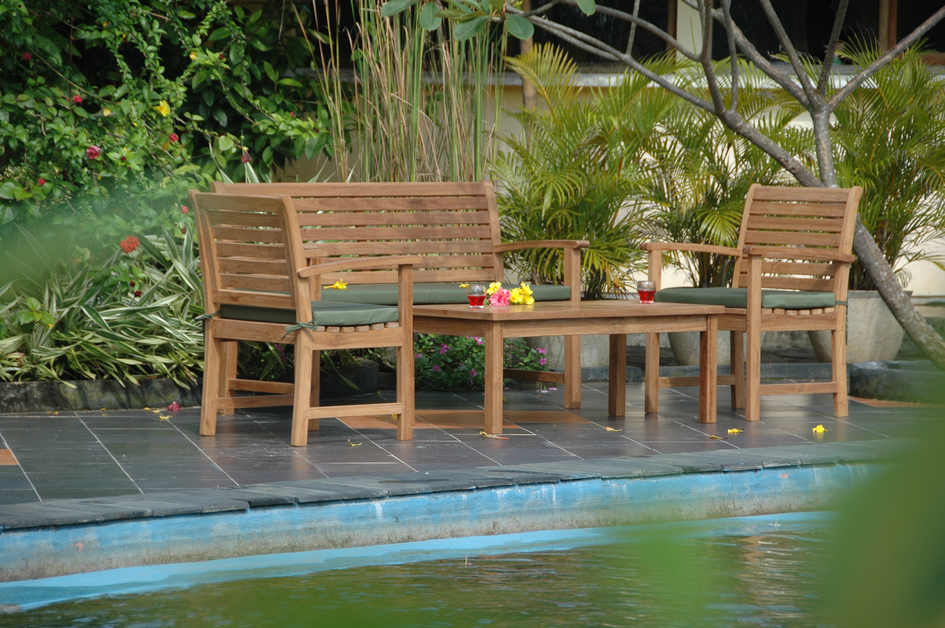 Enjoy a cool evening gathering with family and friends at the comfort of your own backyard with this Victoria Montage Conversation Set. Featuring the Victoria 59" Bench, two Victoria Dining Armchairs and the Montage 47" Rectangular Coffee table, its the perfect outdoor conversation set to enjoy a chat and an outdoor drink. Add cushions made from All-Weather Sunbrella Fabrics for even more comfort. The collection is made of solid teak wood coated in a waterbase sealer for added weather protection. Quality built for generations.