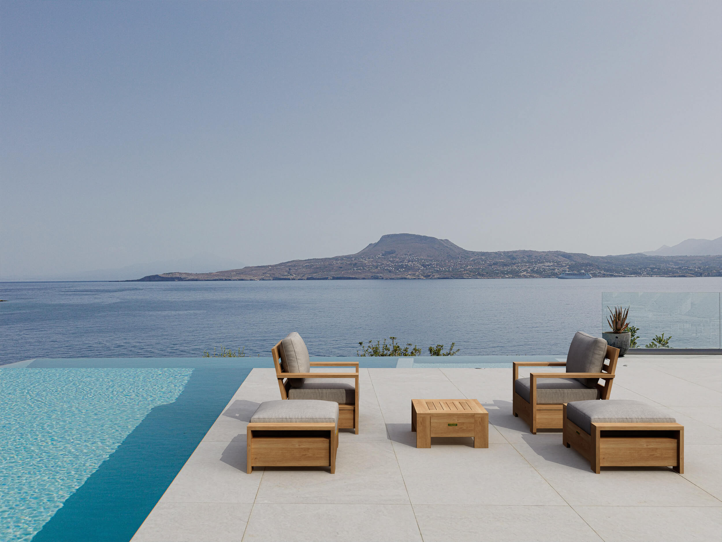 Rest weary legs and relax in deep seating comfort with this 5-Piece Madera Set. Comfortable, stylish and quality-built, it’s made from premium grade teak that’s unfinished and sanded smooth for a natural smooth touch. The perfect place to spend a relaxing evening lounging, drinking, and chatting with a partner or friend, this 5-Piece Madera Set includes two Madera Armchairs, two Madera Ottomans, and the matching Madera Square Side Table, perfect for placing your favorite book, drink or tablet. Includes 6” All-Weather Sunbrella Cushions with color options.