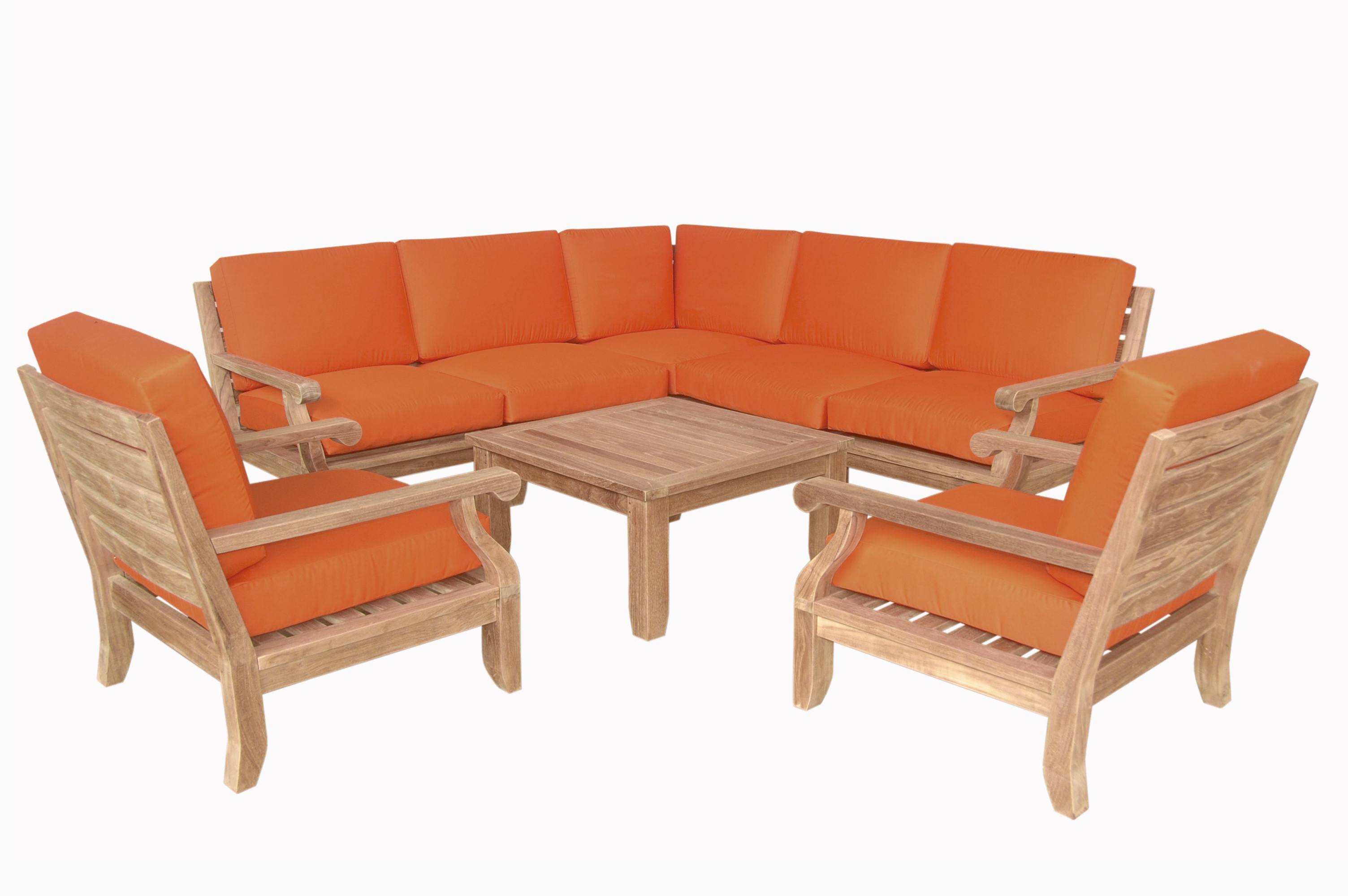 The Riviera Modular Deep Seating indulges whoever sits in its presence and is a standout piece of furniture for the home or yard. At first glance, its considerable size and quality built frame becomes apparently noticeable complementing its stylish curve design and armchair whorl. Made of premium grade unfinished teak sanded smooth, the set arrives with two Riviera Armchairs, a Right, Left and Center modular that sits up to three, the Riviera Rectangular Coffee and Square table, and the Riviera ottoman. Includes 6” thick cushions made from All-Weather Sunbrella Fabrics with choice of color and pattern option.